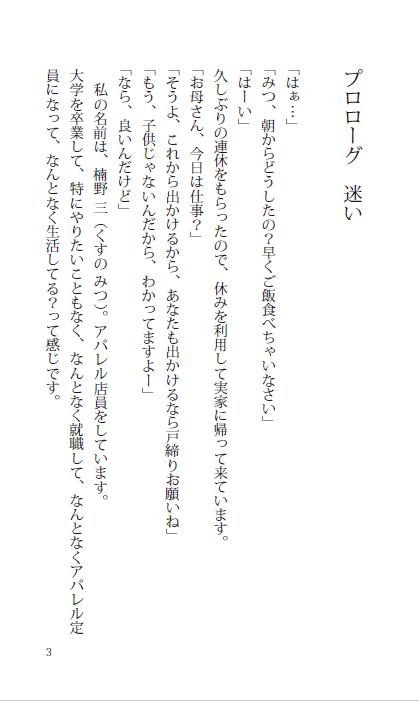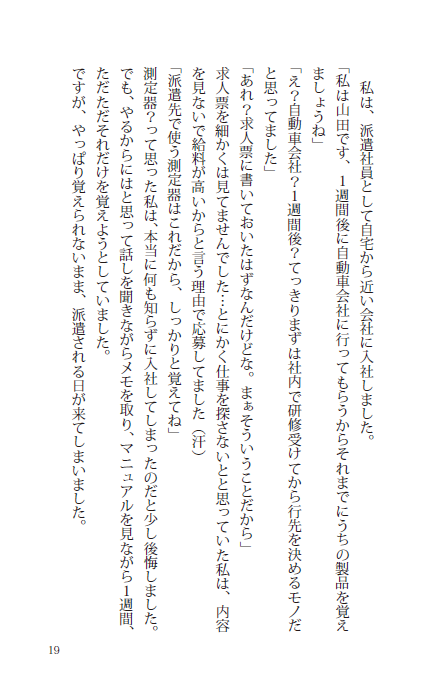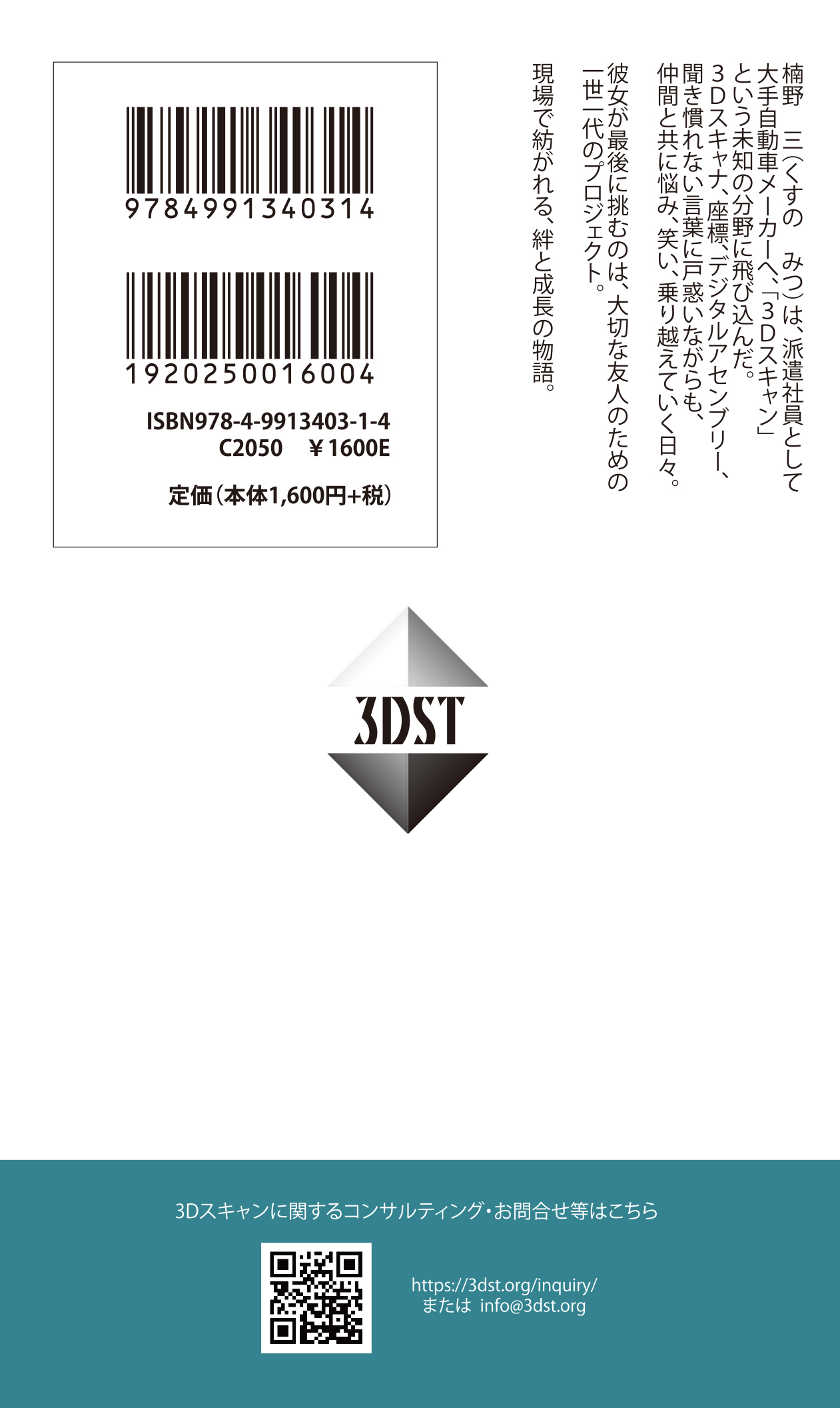 楠野 三(くすの みつ)は、派遣社員として大手自動車メーカーへ、「3Dスキャン」という未知の分野に飛び込んだ。3Dスキャナ、座標、デジタルアセンブリー、聞き慣れない言葉に戸惑いながらも、仲間と共に悩み、笑い、乗り越えていく日々。