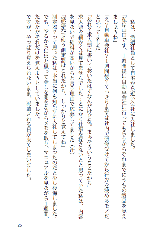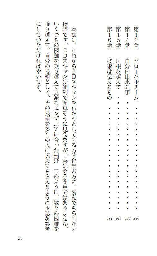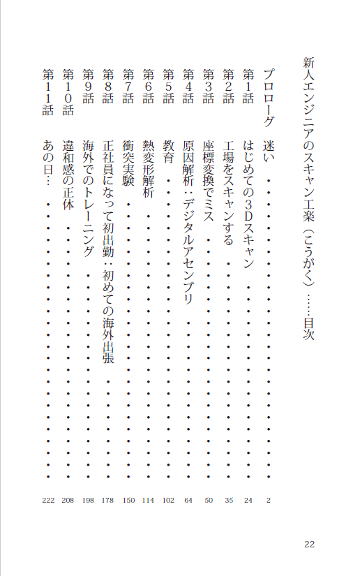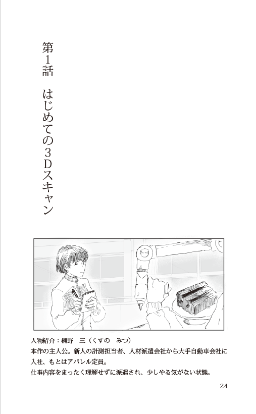 楠野 三(くすの みつ)は、派遣社員として大手自動車メーカーへ、「3Dスキャン」という未知の分野に飛び込んだ。3Dスキャナ、座標、デジタルアセンブリー、聞き慣れない言葉に戸惑いながらも、仲間と共に悩み、笑い、乗り越えていく日々。
